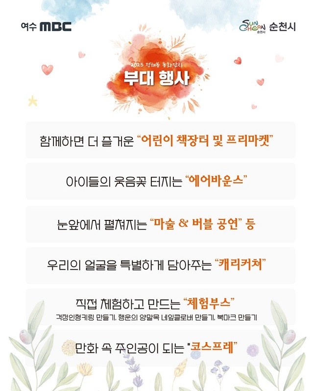 더불어, 올해는 특별히 (재)순천문화재단의 ‘찾아가는 광장 문화콘서트’와 연계해, 에어바운스, 캐릭터 코스프레 등 아이들이 마음껏 뛰놀며 동심을 느낄 수 있는 콘텐츠를 마련해 어린이들의 놀이터를 만들 계획이다.