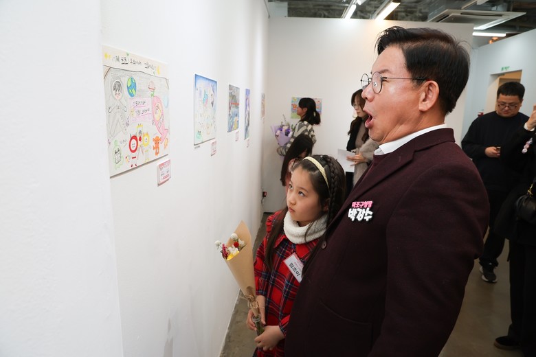 | ▲ 박강수 마포구청장이 수상 어린이와 함께 전시된 그림을 살펴보고 있다. |