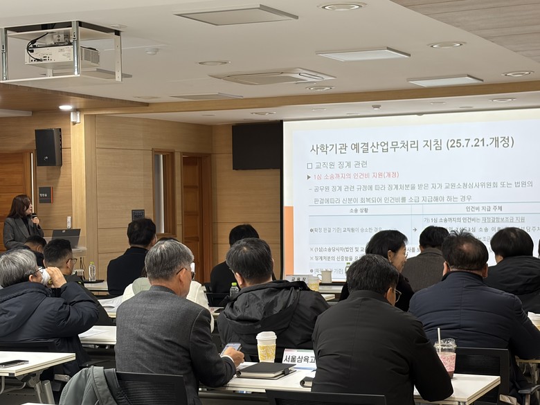 또한 「사학기관 예·결산 업무처리 지침」(2025. 7. 21. 개정)과 「사립학교 사무직원 인사업무 처리 지침」(2026. 1. 1. 시행) 등 최근 개정 사항을 안내하고, 행정사무감사 수감 결과 및 교육지원청 사업부서의 안내 사항도 함께 전달했다.