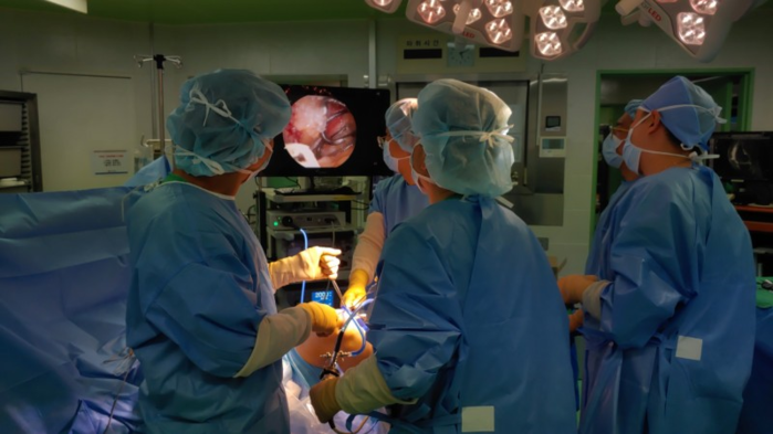 | ▲ 경희대병원 윤경호 주임교수와 의료진들이 카티라이프를 이식하고 있다. |
