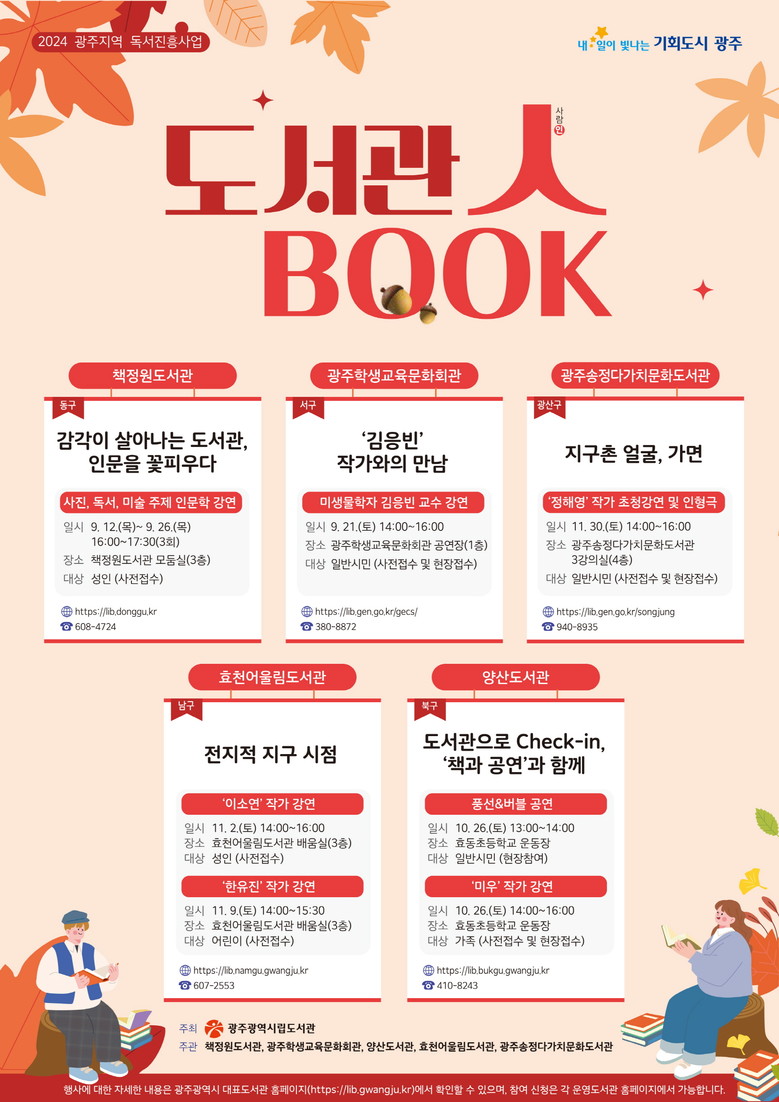 ‘도서관‧人‧book’ 행사에 대한 내용은 광주광역시대표도서관 누리집(https://lib.gwangju.kr)에서 확인할 수 있으며 참가 접수는 각 운영도서관 누리집에서 개별 신청 가능하다. 자세한 사항은 광주시립도서관 관리과(062-613-7733)로 문의하면 된다.
