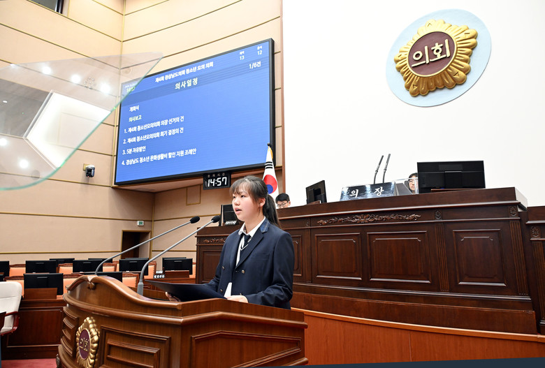 한편, 이날 모의의회에서는 ‘청소년의 건강을 지키기 위한 습관’, ‘독서의 긍정적인 효과’를 주제로 한 5분 자유발언과 ‘경상남도 청소년 문화생활비 할인 지원 조례안’을 상정하여 의결하였다.
