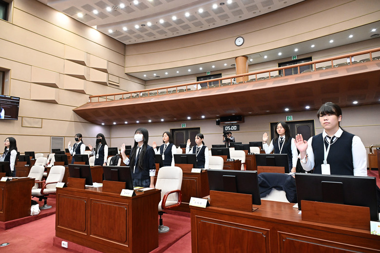 이날 참여한 마산여자중학교 학생들은 먼저 도의회를 견학하고 시청각 자료를 통해 도의회의 구성과 역할에 대해 알아본 후 직접 작성해 온 내용으로 5분 자유발언과 조례안 발의 및 토론을 진행하며 실제 의사결정 과정을 경험하였다.