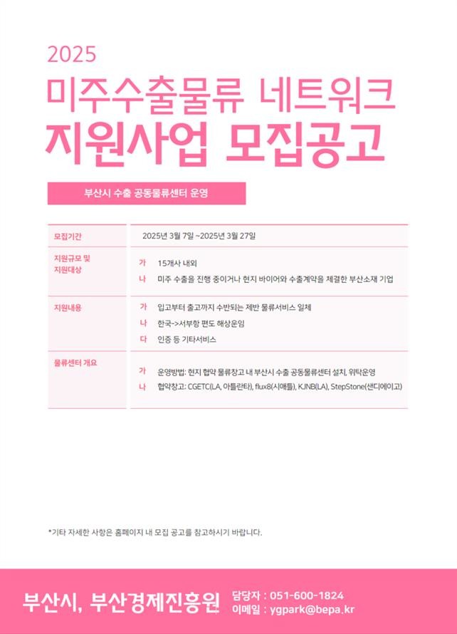 「미주 수출 물류네트워크 지원 사업」은 해외에 독자적으로 물류센터 구축이 어려운 부산 중소기업에 미주 현지 창고를 공동 사용할 수 있는 기회를 제공하고 현지물류센터 기반 시설(인프라)을 활용한 맞춤형 물류 서비스를 제공하는 사업이다.