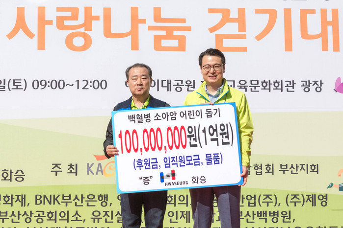 한국백혈병소아암협회 부산지회(부산지회장 박동호)가 주최하는 이번 행사에 화승은 현금 및 임직원 모금, 물품 등 총 1억원을 후원했으며, 행사 곳곳에 이벤트 존을 설치해 걷기대회에 참여한 시민들을 위해 다양한 먹거리 등 즐거움을 선사하는 등 사랑나눔을 아끼지 않았다.