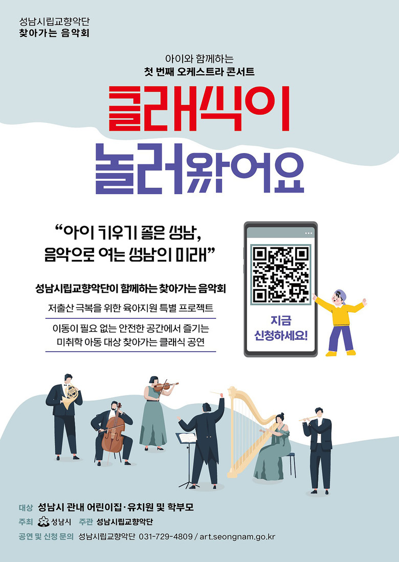 음악회 관람을 희망하는 유치원, 어린이집 등은 성남시립교향악단 홈페이지(공지사항)에서 세부 일정과 내용 확인 후 전화(☏ 031-729-4809)로 신청하면 된다.