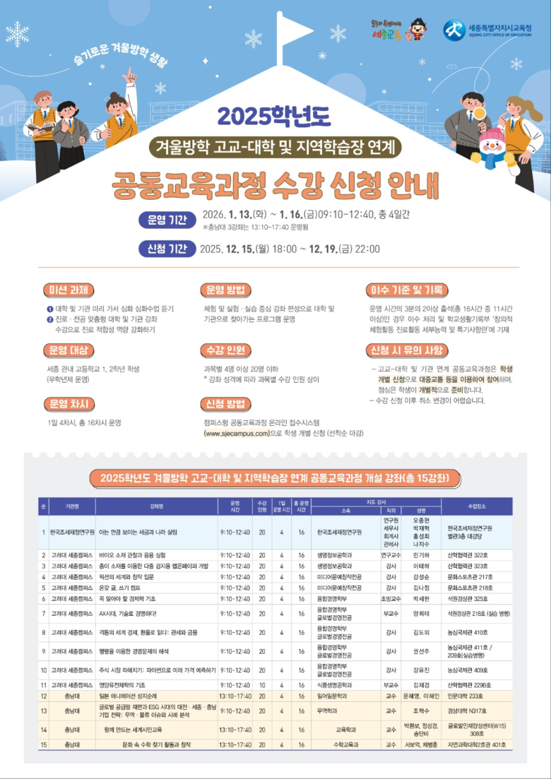 2025학년도 겨울방학에는 고려대학교 세종캠퍼스에서 개설된 ‘종이 소재를 이용한 다중 검지용 랩온페이퍼 개발’, ‘주식 시장 파헤치기: 파이썬으로 미래 가격 예측하기’ 등 총 14개 강좌에 164명의 학생이 참여할 예정이다.