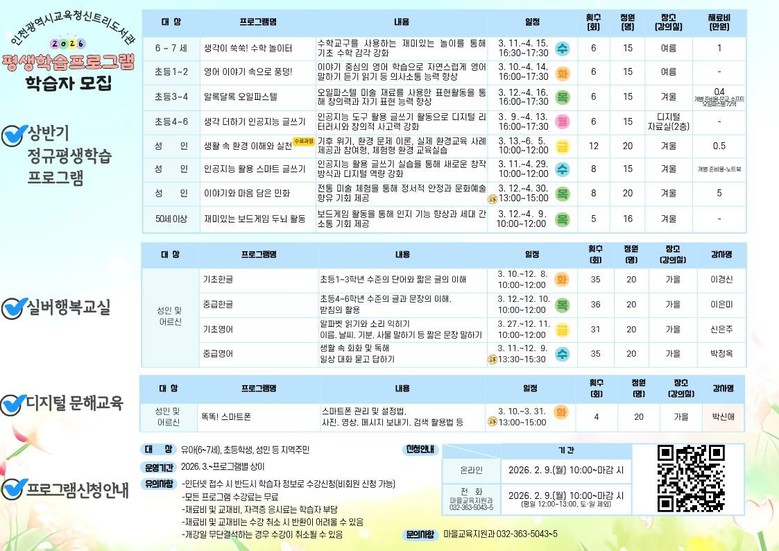 성인 대상 프로그램은 ▶‘생활 속 환경 이해와 실천’ ▶‘인공지능(AI) 활용 스마트 글쓰기’ ▶‘이야기와 마음 담은 민화’ ▶ 50세 이상 주민의 ‘재미있는 보드게임 두뇌 활동’ 등을 운영한다.