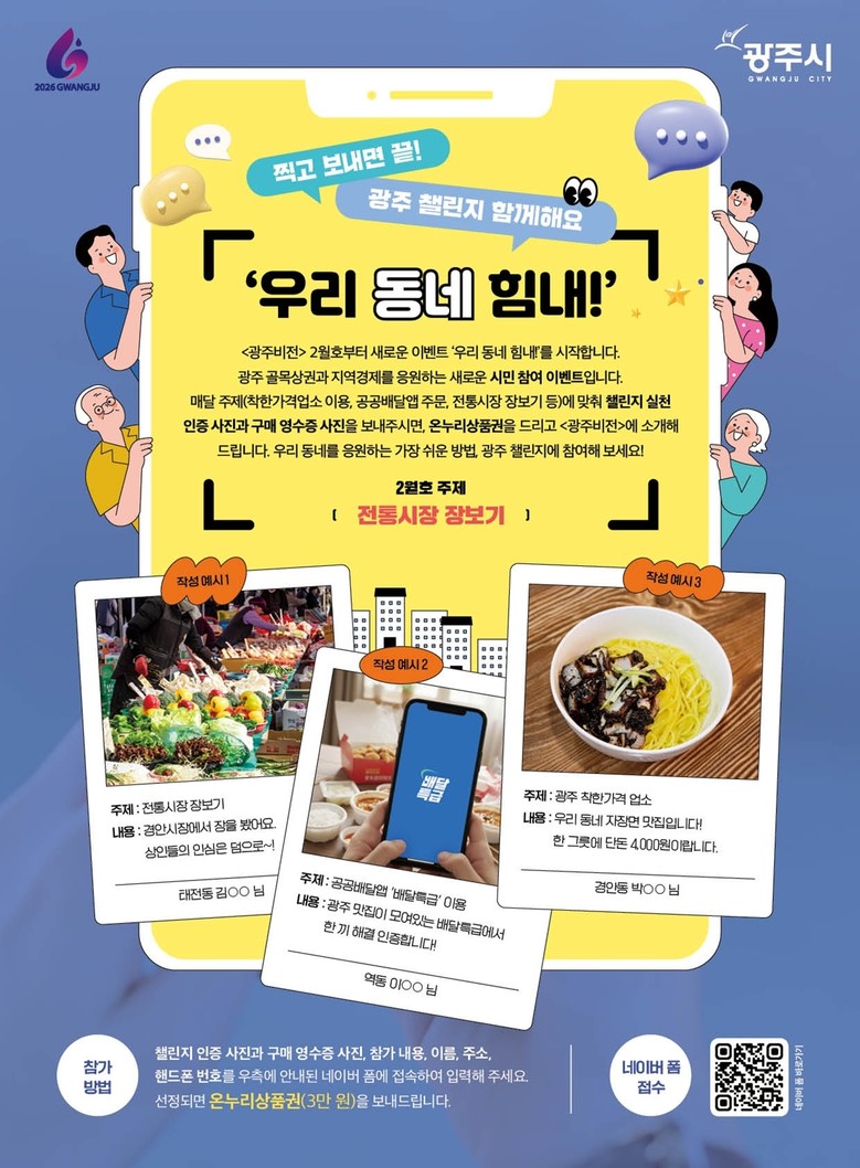 특히, ‘우리동네 힘내’ 코너에서는 독자 참여형 행사를 운영한다. 전통시장 장보기, 공공배달앱 이용, 착한가게 방문 등 월별 주제를 제시하고 참여 시민 중 선정자를 대상으로 온누리상품권을 지급해 시민 참여를 지역 내 소비로 연계할 계획이다.