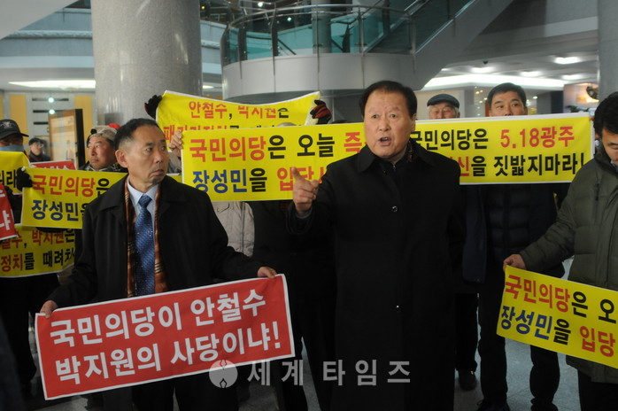 13일 전북도의회에서 국민의당 '전북지역 순회 최고위원회의'가 개최된 가운데 회의장 밖에서 장성민 전 의원의 지지자들이 장 전 의원의 입당을 보류한 국민의당 지도부에 거센 항의를 하고 있다. 2017.02.13.