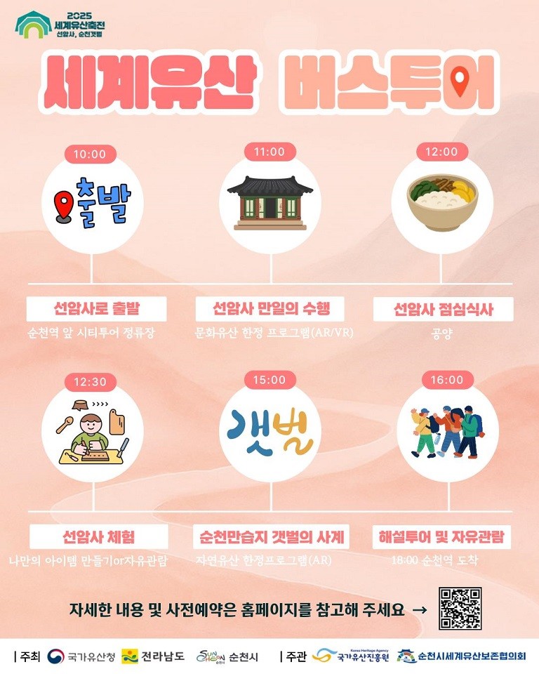 버스투어는 축전기간 매주 화요일부터 토요일까지 총 12회가 운영되며, 선착순으로 회당 18명씩 접수받고 있다. 참가비는 1만원이며, 사전예약은 순천세계유산축전 공식 홈페이지(https://scwhf.com) 또는 축전사무국(061-753-2480)을 통해 가능하다.