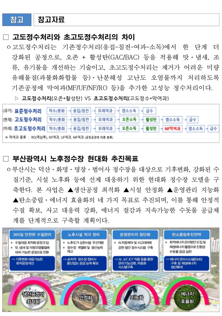 본부는 기후변화에 따라 낙동강 원수 내 미량오염물질(과불화화합물 등)에 대한 대응을 강화하고, 40년 이상 경과한 노후 정수장의 시설 공정을 단계적으로 개선·고도화하기 위한 정수장 현대화 사업을 본격 추진한다.