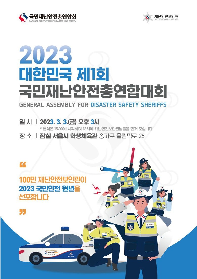 2023년 제1회 국민재난안전총연합대회는 ‘재난안전보안관’ 양성을 목표로 출범하는 행사로서 2022년 ‘재난안전보안관’ 활동을 희망하는 신청자 10만 명 중 전국 5천 명을 선발, 초청하여 226개 시ㆍ군ㆍ구 지자체 국민의 안전을 다짐하는 행사이다.