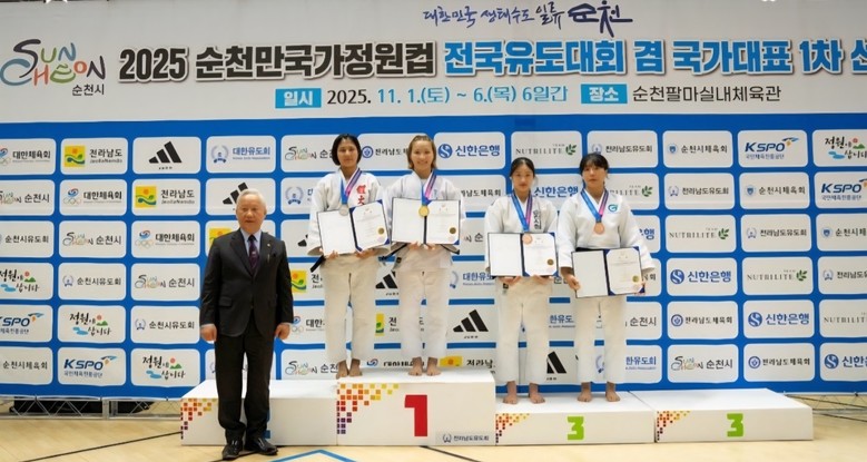 | ▲ 지난 1일 순천시청 신채원 선수(우측에서 2번째)가 순천에서 열린 2025 순천만국가정원컵 전국유도대회에서 개인전 동메달 수상 기념사진을 촬영하고 있다 |