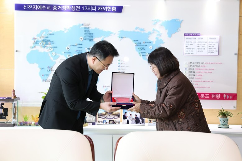지난 19일 전주지역아동센터 대표가 신천지자원봉사단 전주지부장에게 감사패를 전달하고 있다.