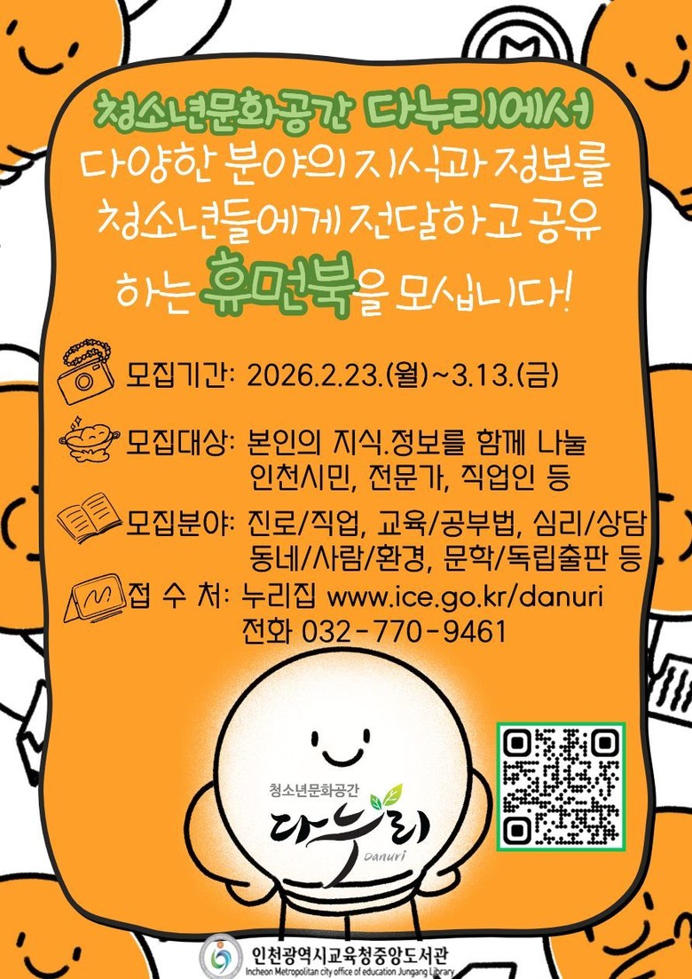 모집은 인천 시민 중 전문 지식이나 독특한 이력을 가진 직업인, 예술가 등을 대상으로 하며, 다누리 누리집에서 2월 23일부터 3월 13일까지 신청할 수 있다.