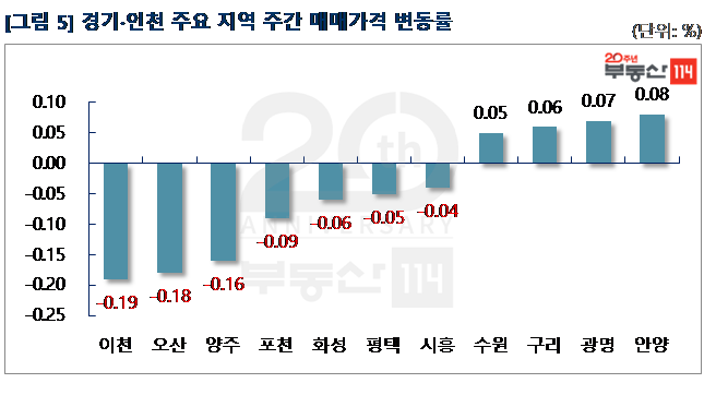 경기ㆍ인천은 ▼동두천(-0.30%) ▼화성(-0.08%) ▼오산(-0.08%) ▼광주(-0.07%) ▼용인(-0.06%) 순으로 떨어졌다. 동두천은 송내동 송내주공4단지 소형면적이 250만원 하락했다. 화성은 진안동 주공그린빌10·11단지가 250만원-1,500만원 떨어졌다. 반면 △안양(0.08%) △안성(0.07%) △광명(0.06%) 등은 올랐다. 안양은 안양동 래미안안양메가트리아가 500만원-1,000만원 상승했다. 안성은 공도읍 벽산블루밍디자인시티가 250만원 올랐다.