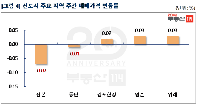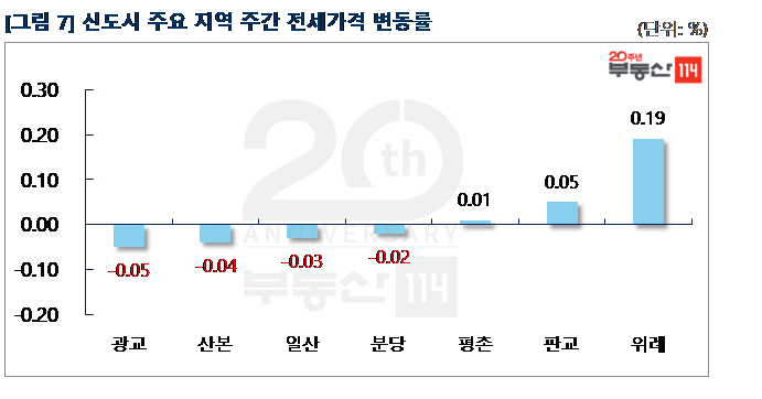 신도시는 ▼광교(-0.05%) ▼산본(-0.04%) ▼일산(-0.03%) ▼분당(-0.02%) 순으로 떨어졌다. 광교는 원천동 광교중흥S클래스 2,231가구 입주 영향으로 전세가격이 약세를 나타냈다. 하동 힐스테이트광교가 500만원 하락했다. 산본은 금정동 율곡3단지와 퇴계3단지주공이 500만원-1,500만원 떨어졌다. 반면 △위례(0.19%) △판교(0.05%) △평촌(0.01%) 등은 상승했다. 위례는 학암동 위례롯데캐슬, 장지동 위례IPARK1차, 창곡동 위례호반베르디움이 500만원-750만원 상승했다.