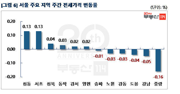서울 전세시장은 △성동(0.13%) △서초(0.13%) △성북(0.04%) △동작(0.03%) △강서(0.02%) 지역은 상승한 반면 ▼중랑(-0.16%) ▼강남(-0.05%) ▼도봉(-0.04%) ▼강동(-0.03%) ▼노원(-0.03%) 등은 하락했다. 성동은 하왕십리동 왕십리센트라스와 금호동4가 서울숲푸르지오가 500만원-1,500만원 올랐다. 서초는 서초동 진흥아파트 전세가격이 1,000만원-1,500만원 상승했다. 반면 중랑은 상봉동 LG쌍용이 1,000만원-2,000만원 떨어졌다. 강남은 수서동 강남더샵포레스트가 대형면적을 중심으로 2,500만원-5,000만원 빠졌다.