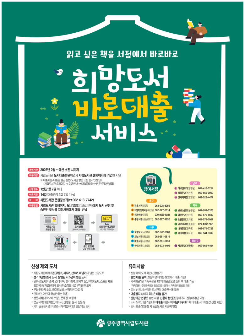 신청 방법 등 자세한 사항은 시립도서관 누리집을 참고하거나 무등도서관 자료팀(062-613-7742)으로 문의하면 된다.