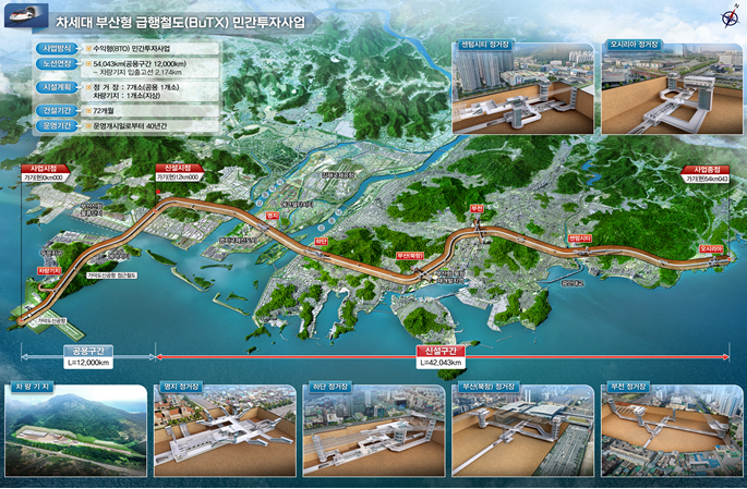 이어 ▲2026년 상반기 시의회 동의와 민간투자사업 심의를 거쳐 제 3자 제안공고를 실시하고, ▲2027년 실시협약 및 사업자 지정 등 행정절차를 신속히 진행해 가덕도신공항 개항 시기에 맞춰 차세대 부산형 급행철도(BuTX)를 개통할 계획이다.