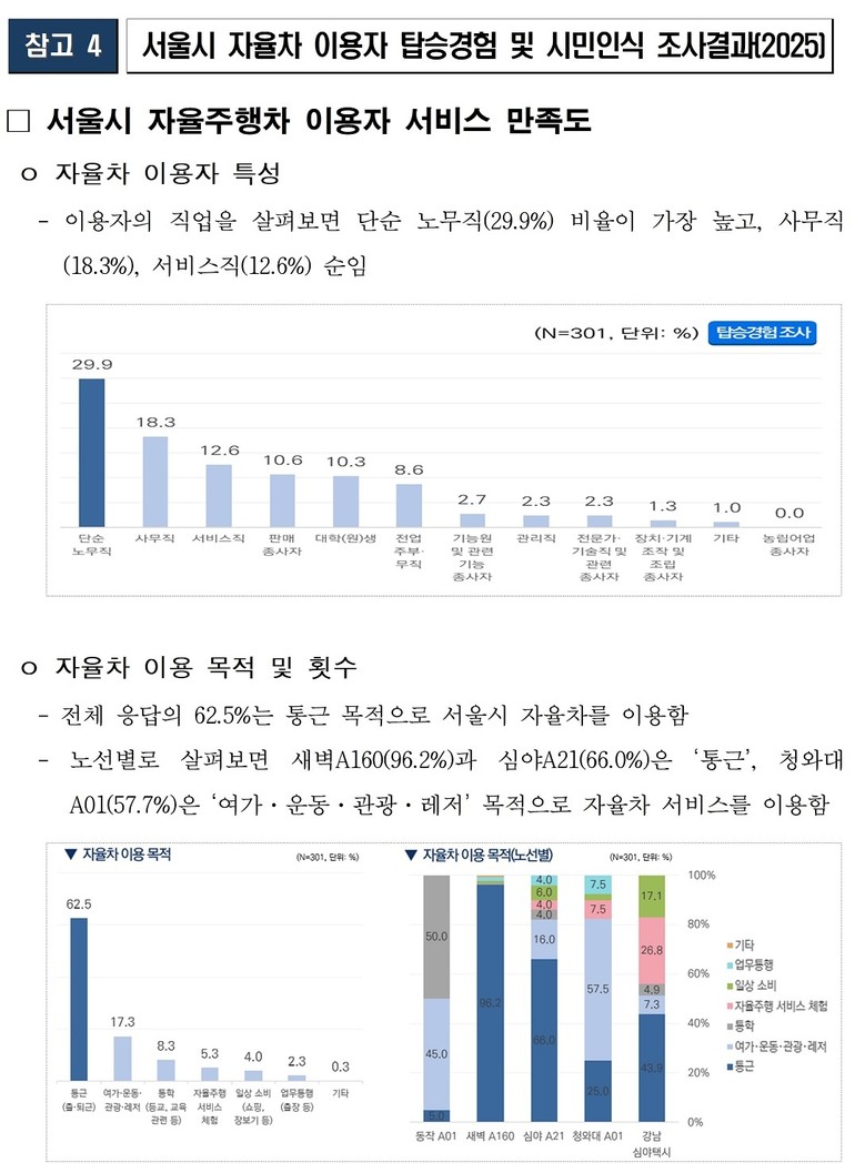 특히 A160 노선 이용자 중 통근 목적의 탑승객이 96.2%로 대부분을 차지했으며, 50대 이상 연령대가 85.4%, 66.2%가 단순 노무직인 것으로 나타나 이른 새벽에 출근하는 환경미화원·경비원 등 현장 노동자들의 이동 편의를 증진한다는 당초의 정책 목적에도 부합하는 것으로 확인됐다.