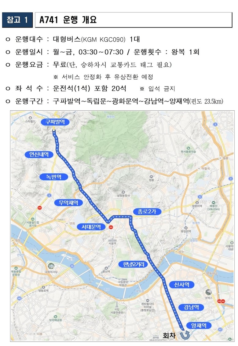 특히 이번 노선은 주요 정류소에만 정차하는 급행 시스템이 도입됐다. 기존 741번의 일부 구간을 단축해 급행으로 운영되는 A741 노선은 평일(월~금) 새벽 3시 30분 구파발역에서 출발해 광화문역, 신사역, 강남역 등을 거쳐 양재역까지 23.5km 구간을 왕복 1회 운행한다.