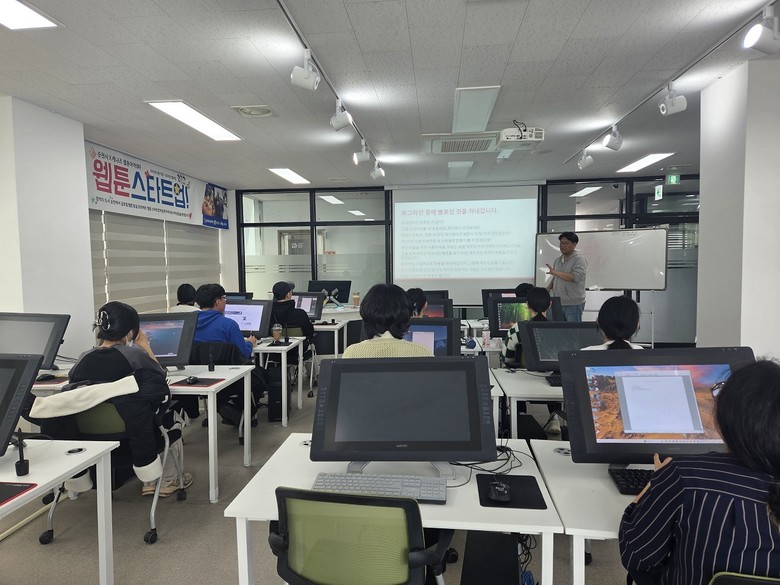 | ▲ 지난 4월 15일 예비창작자들이 웹툰센터에서 웹툰스타트업 교육 프로그램에 참여해 강의를 듣고 있다 |
