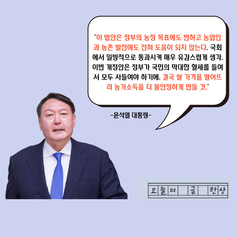 윤 대통령은 “이번 개정안은 농업 생산성, 농가 소득을 높이는 이른바 ‘농정 목표’에도 반하는 법안이고 더불어 현재 도움이 필요한 농촌 발전에도 전혀 도움이 되지 않는 법안”이라며 “남는 쌀을 정부가 막대한 혈세를 들여 모두 사들이는 것은 오히려 독이 된다.”이라고 했다.