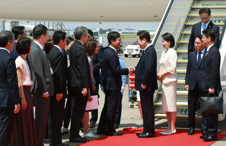 [세계타임즈 = 진정화 기자] 1박2일 일정으로 일본을 방문하는 이재명 대통령과 김혜경 여사가 23일 일본 도쿄 하네다공항에 도착해 환영 인사들과 인사하고 있다. 2025.8.23