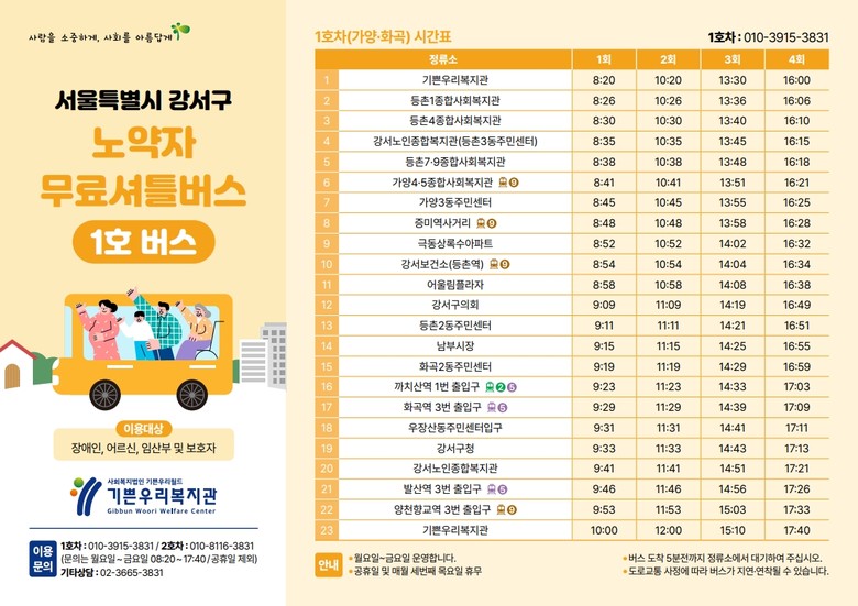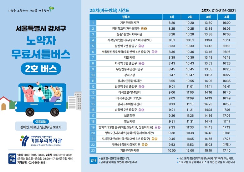 자세한 버스 시간표 및 노선은 강서구청 누리집(복지>장애인복지)에서 확인할 수 있다.