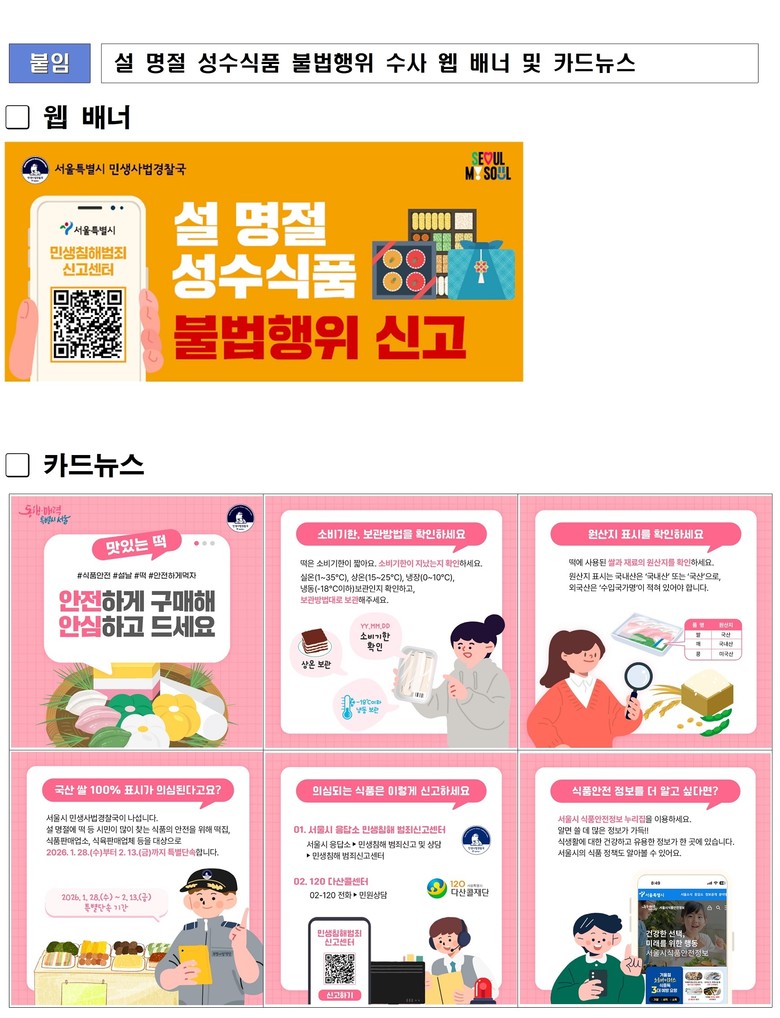 - 市, 시민건강 위협하는 식품 범죄행위에 대한 적극적 시민 신고 요청 [서울 세계타임즈=이장성 기자] 서울시 민생사법경찰국(이하 ‘민사국’)은 설 명절을 앞두고 시민이 안심하고 성수식품을 구매할 수 있도록 1월 28일부터 2월 13일까지 원산지 표시와 식품안전 위해행위를 특별단속한다.