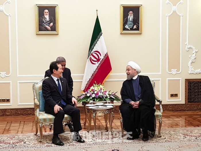 [세계타임즈 이채봉 기자]이란을 공식 방문 중인 정세균 국회의장은 현지시간 8월 5일(토) 오전 이란 테헤란의 대통령궁에서 호자토레슬람 하산 로하니(Hojjatoleslam Hassan Rouhani) 이란 대통령을 만나 양국간 교류 및 협력 증진 등을 논의했다.
