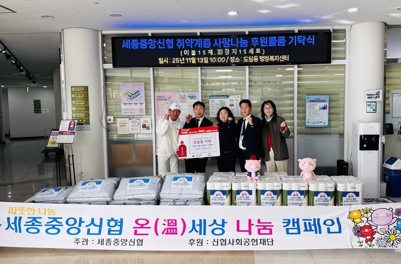 이기숙 도담동장은 “어려운 이웃을 위해 소중한 물품을 후원해 주신 도담동 세종중앙신협에 깊이 감사드린다”며 “나눠주신 따뜻한 마음까지 도움이 필요한 분들에게 잘 전달될 수 있도록 하겠다”고 전했다.