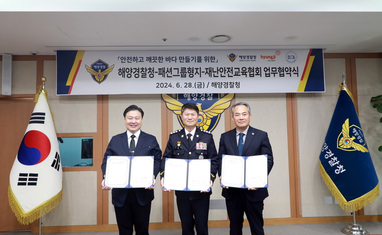패션그룹형지는 지난 28일 해양경찰청, 재난안전교육협회와 송도 소재 해양경찰청에서 해양안전 및 해양환경보호 활동 추진 기반 마련을 위한 3자간 사회공헌 업무협약(MOU)을 체결했다.