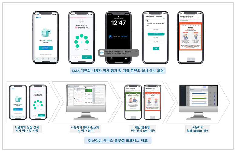 | ▲생태순간평가(EMA) 기반의 사용자 정서 평가 및 개입 콘텐츠 실시 예시 화면 및 정신건강 서비스 솔루션 프로세스 개요.(사진=용인세브란스 병원) |