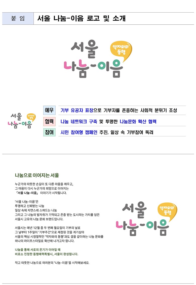 서울시는 이를 계기 삼아 ‘작은 나눔의 온정이 서로에게 이어질 때 온기 가득한 서울이 된다’는 메시지를 담은 서울 고유의 나눔 문화 브랜드를 발표하고,