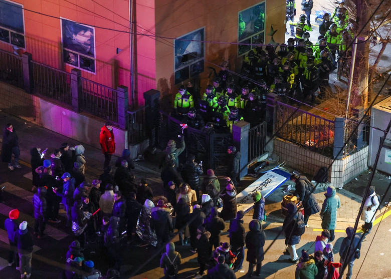 영장심사 종료 후에도 시위를 이어가던 지지자들은 이날 오전 3시께 윤 대통령 구속영장 발부 소식이 전해지자 극도로 흥분해 법원 후문에서 경찰 저지를 뚫었다. 2025.1.19