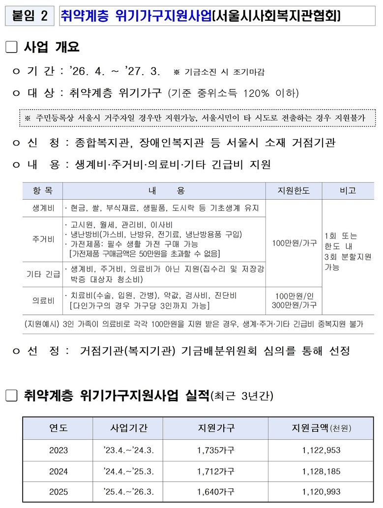 ‘취약계층 위기가구 지원사업’은 긴급복지지원 등 공적 지원을 받지 못한 위기가구에 생계비, 주거비 등 가구당 최대 100만 원까지 지원한다. 단, 의료비는 개인 기준으로 가구당 최대 3인까지 300만 원을 지원받을 수 있다.