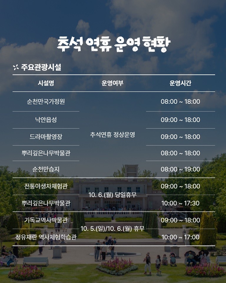 또한 연휴 동안 순천 전역에서 시민과 관광객이 함께 즐길 수 있는 다채로운 프로그램이 운영된다.