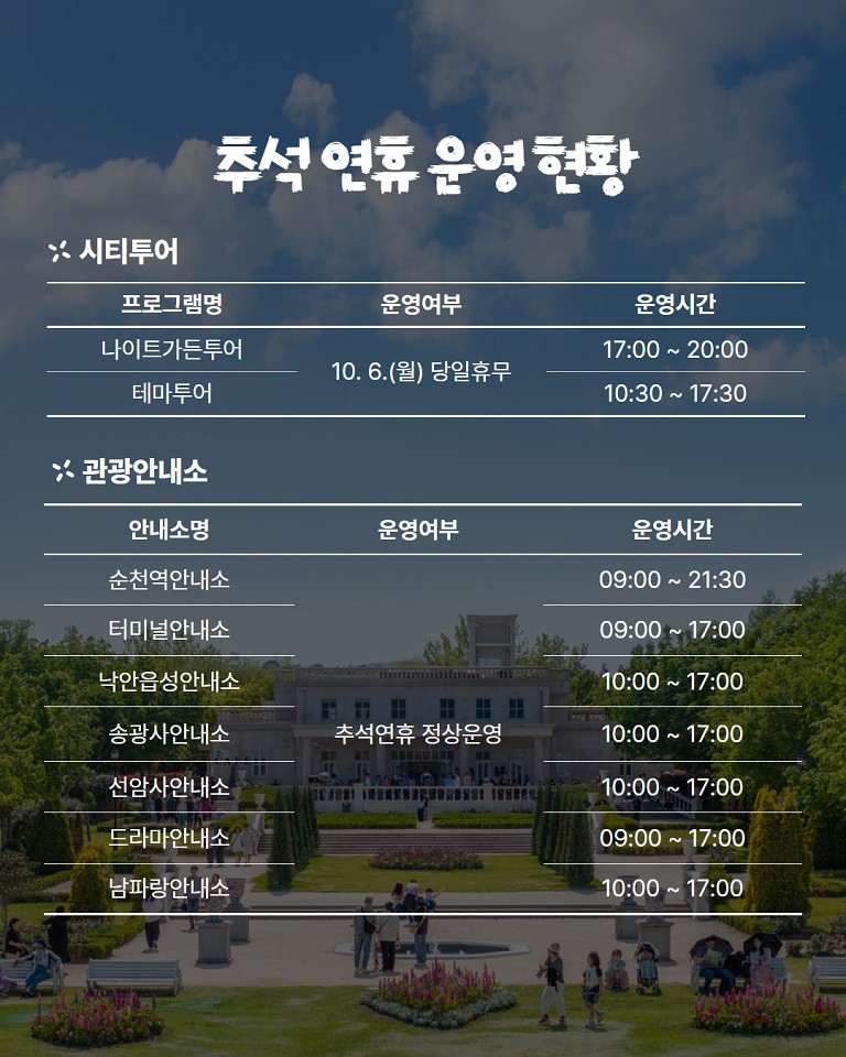 시는 또 온라인 홍보도 강화한다. 사전 카드뉴스·티저 영상을 활용한 홍보와 더불어 연휴 기간에는 ‘추석 in 순천’ 해시태그 이벤트를 운영해 참여자에게 기념품을 증정한다. 이후에는 관광 후기 콘텐츠를 공유해 순천 관광의 매력을 전국에 확산시킬 계획이다.