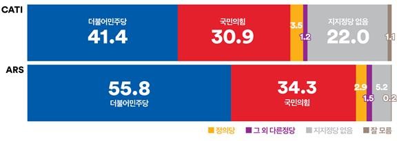 같은 기간 실시한 ARS 조사에서 더불어민주당은 지난 주 대비 4.7%p 상승한 55.8%, 국민의힘은 0.3%p 상승한 34.3%로 집계되었다. 더불어민주당은 올 해 들어 가장 높은 지지율을 획득, 국민의힘과의 격차도 21.5%p로 가장 크게 벌렸다. 더불어민주당은 수도권, 충청권, 호남권에서 크게 올라, 더불어민주당의 상승을 견인했고, 국민의힘은 수도권 외 지역에서 상승했다. 더불어민주당은 40대의 미미한 하락을 제외한 전 연령에서 상승해, 지난 주 동률이었던 60대의 지지율도 12%p 앞섰다(60대: 더불어민주당 52.0% 국민의힘 40.0%). 국민의힘은 보수층에서 9.2%p 상승으로 보수층 결집을 보여줬으나 진보층, 중도층 모두 더불어민주당 상승, 국민의힘 하락으로 더불어민주당의 상승세를 꺾진 못했다. 중도층은 더불어민주당 57.9% 국민의힘 29.8%로 집계되었다.