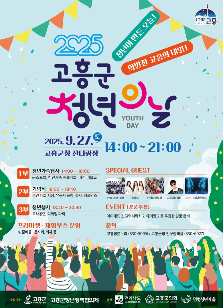 올해 행사는 ‘청년이 만든 오늘! 희망찬 고흥의 내일!’이라는 슬로건으로 청년이 주인공이 되는 축제의 장으로 마련되며, 청년의 도전과 열정을 응원하기 위한 뜻깊은 자리가 될 예정이다.