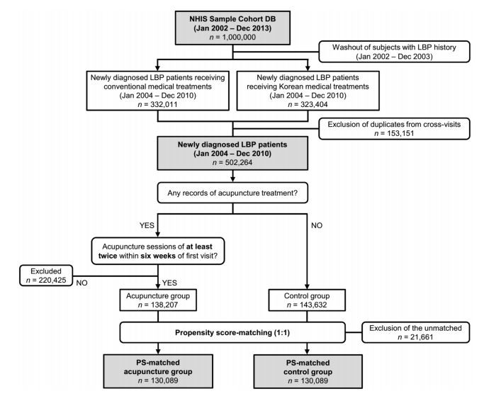 연구팀은 국민건강보험공단의 표본코호트 데이터베이스(Sample cohort database)를 분석하여 우리나라 요통환자들에게 있어서 침치료와 요추수술률의 연관성을 살펴봤다. 연구팀은 건강보험 통계자료를 토대로 2004년부터 2010년까지의 모든 요통환자들을 추적해 향후 2년간 발생한 요추수술의 비율을 조사했다. 총 100만 명으로 구성된 이번 데이터베이스에서 7년간 발생한 50만2264명의 요통환자 중 요통이 처음 나타났을 때 침치료를 받은 군 13만8207명과 침치료를 시행하지 않은 군 14만3632명의 환자를 분석했다.