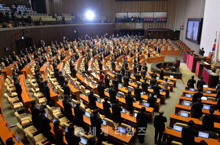 1일 오후 서울 여의도 국회 본회의장에서 열린 국회 임시회 개회식에 참석한 여야 의원들이 국민의례를 하고 있다. 2017.02.01.