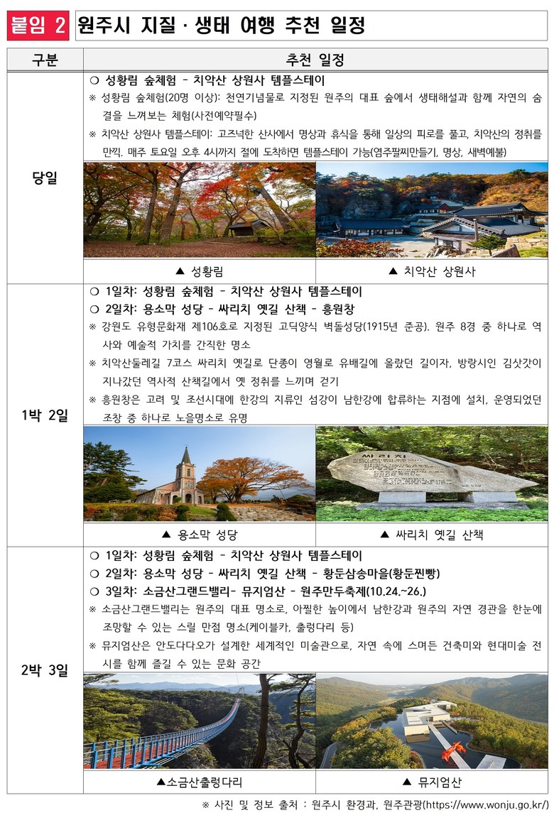 이와 함께 성황림마을에서는 △‘제1회 꿩설화 축제’(11.2.)가 열려 치악산 꿩설화의 배경지를 따라 슬로우 러닝대회와 트레킹 프로그램을 체험할 수 있다. 또 △‘성황림 숲체험’(~11월) 프로그램을 통해 전문 해설사와 함께 천연기념물 숲을 탐방하며 생태적 가치를 직접 느껴볼 수 있다.