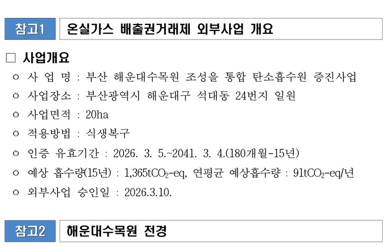 시는 지난 3월 10일 ‘부산 해운대수목원 조성을 통한 탄소흡수원 증진사업’에 대해 공식 승인을 획득했다.