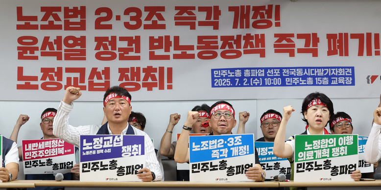 2일 서울 중구 정동 전국민주노동조합총연맹에서 열린 '노조법 23조 즉각 개정, 윤석열 정권 반노동정책 즉각 폐기, 노정교섭 쟁취' 기자회견에서 양경수 위원장 등 참석자들이 구호를 외치고 있다. 2025.7.2