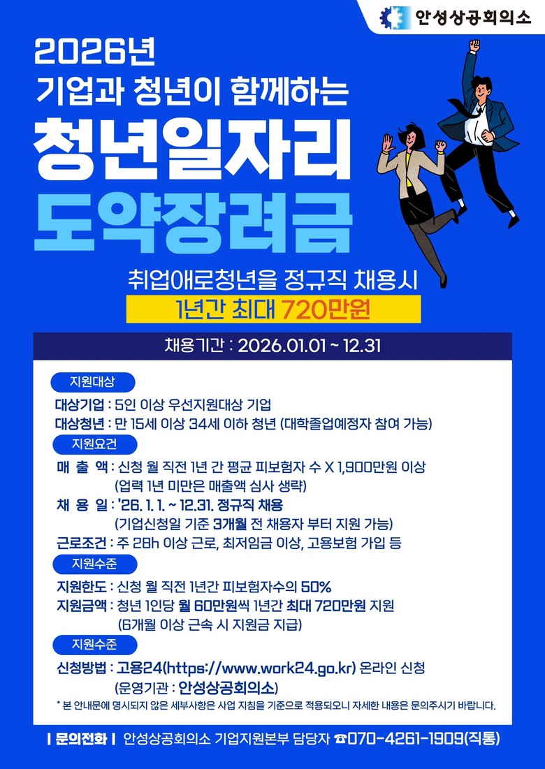 2026년 청년일자리도약장려금 사업에 참여를 희망하거나 관련된 자세한 내용을 알고 싶은 안성과 평택 지역 기업과 청년은 안성상공회의소(070-4261-1909)로 문의하거나 안성상공회의소 홈페이지 공지사항을 참조하면 된다.