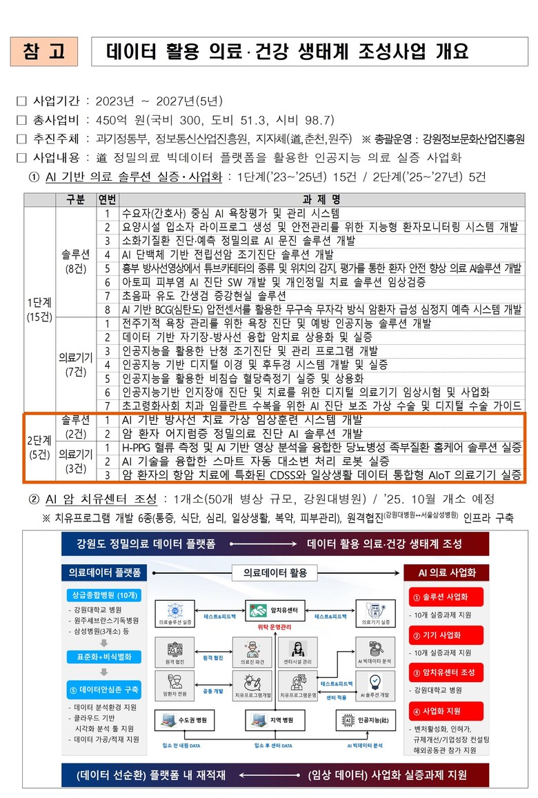 본 사업은 강원특별자치도가 도내 10개 병원과 협력해 구축한 ‘정밀의료 빅데이터’를 기반으로, 에이아이(AI) 기반의 의료 혁신 서비스를 개발하고, 강원대학교병원 내 조성 중인 ‘에이아이(AI) 암 치유센터’에서 실증을 추진하는 데이터 기반 인공지능 의료산업 육성사업이다.